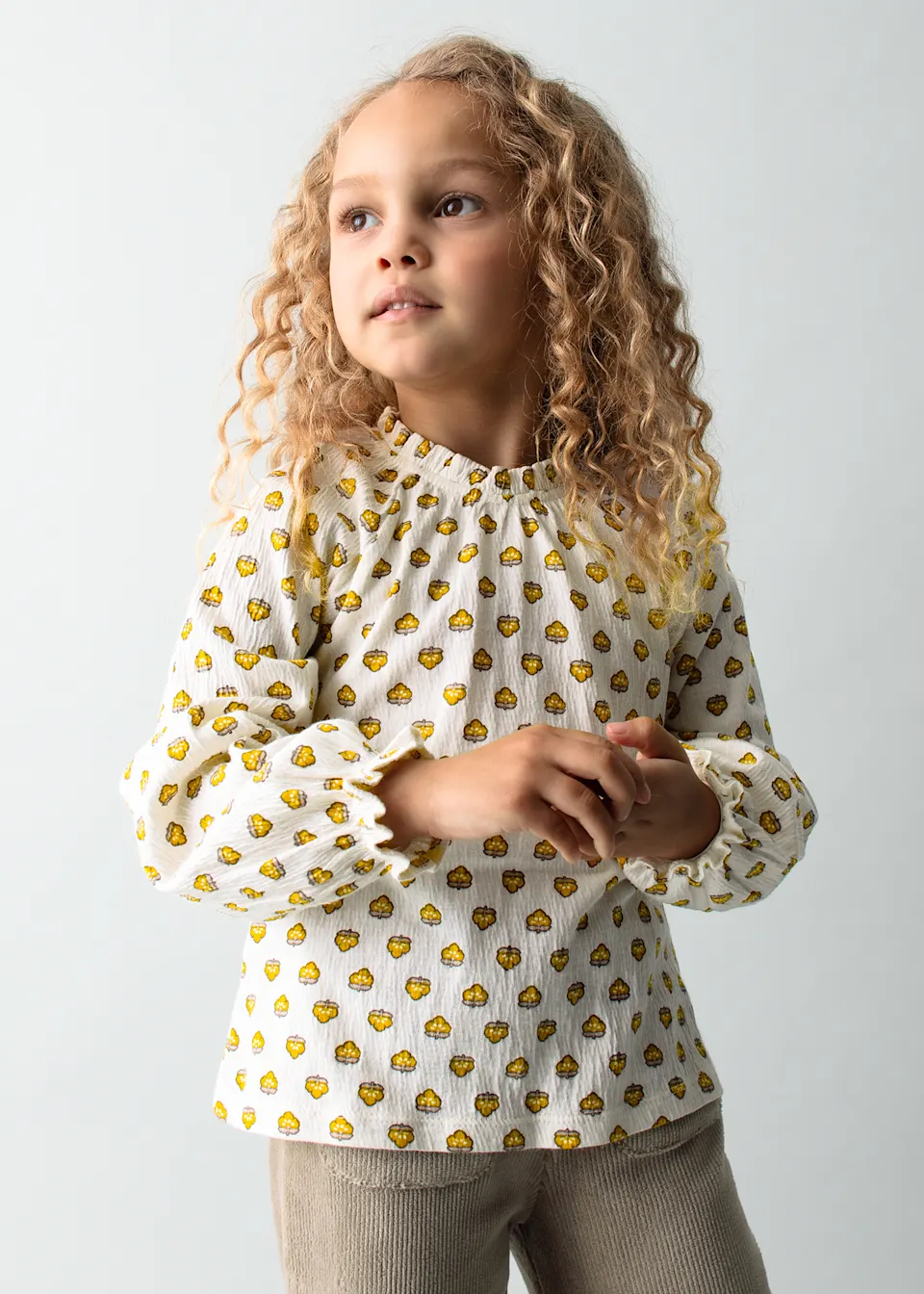 Camiseta de manga larga para niña con volante en la bocamanga. Abertura con botón en el cuello para facilitar la puesta de la prenda.