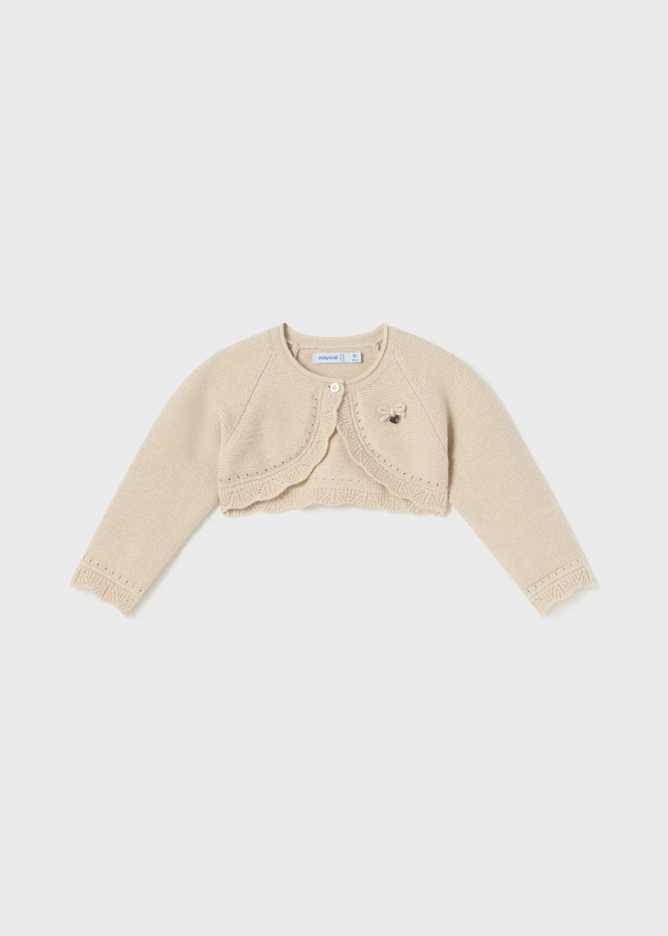 Torera de manga larga para bebé. Diseño corto de tipo bolero. Abertura con botón en el cuello para facilitar la puesta de la prenda.